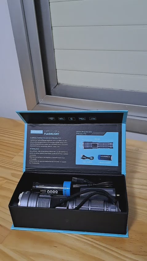 A lanterna é recarregável via USB, o que proporciona praticidade e economia, além de incluir duas baterias como brinde.