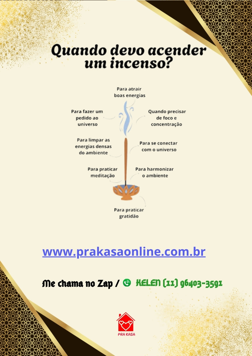 Um dos principais benefícios atribuídos ao incenso é a purificação energética do ambiente, além da atração de boas energias. Ele também pode facilitar as práticas de meditação e Yoga, pois colabora com a conexão – relaxando a mente, promovendo o foco e diminuindo a ansiedade.